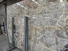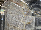Crystalline Marble Slab showcases the raw elegance of fractured stone formations refined into a polished architectural surface. Its cool gray and taupe base is interlaced with crystalline structures and fine mineral veining, creating a complex yet balanced visual texture. The result is a slab that feels both geological and modern — calm at a distance, intricate up close.